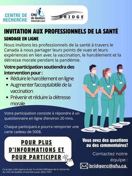 Nous vous invitons à participer à une enquête qui vise à décrire les perspectives et les expériences de professionnels(elles) de la santé à travers le Canada en lien avec la vaccination, le harcèlement et la détresse morale durant la pandémie.