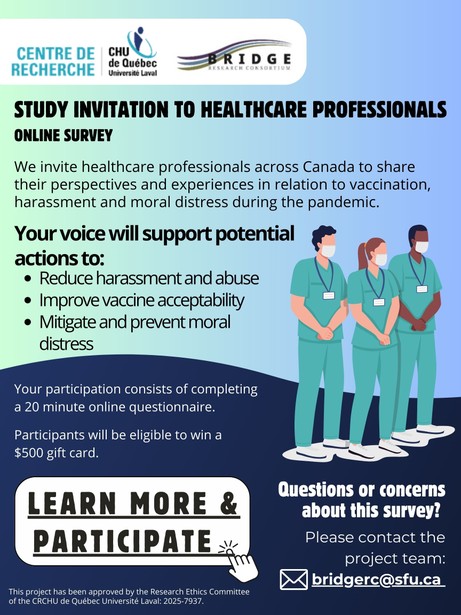 We invite you to participate in a survey designed to understand the perspectives and experiences of healthcare professionals across Canada in relation to vaccination, harassment and moral distress during the pandemic.