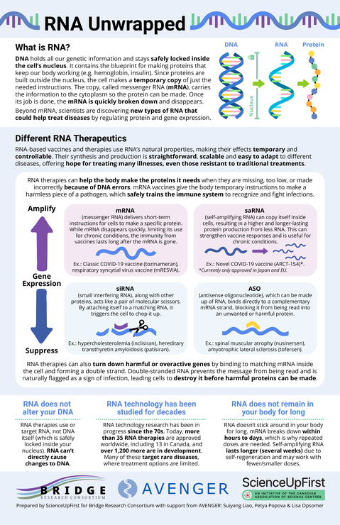 "RNA Unwrapped” is a one page explainer of RNA technologies created for healthcare workers by the Bridge Research Consortium and ScienceUp First, with contributions from AVENGER scientists.